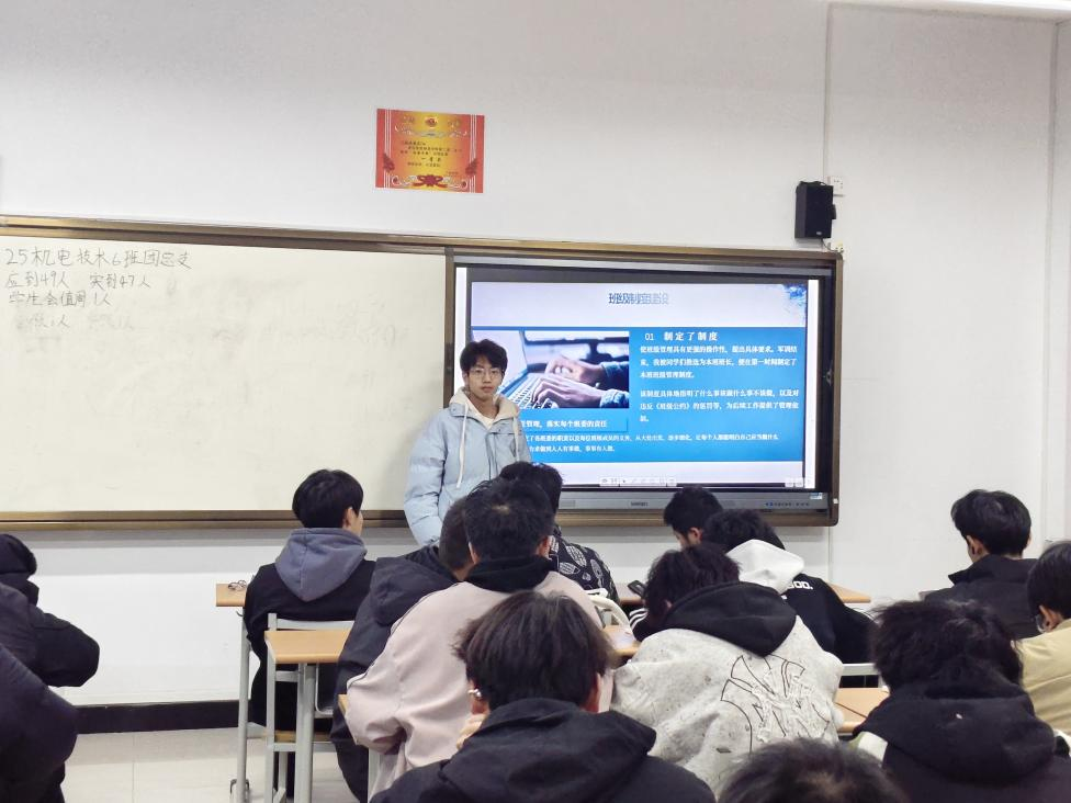 其余班干部充分发挥协同作用,形成高效工作合力:组织委员提前统计参会人数,确保活动有序开展;宣传委员实时记录宣讲精彩瞬间,整理图文素材;学习委员结合专业学习特点,补充分享“以学立标”的实践方法;文艺委员、体育委员则结合自身职责,提出特色活动合作思路,为班级团学活动创新出谋划策。整场宣讲培训既有理论知识的精准传递,又有实践经验的鲜活分享,更有分工协作的生动展现,让全体团员对团学工作有了更清晰的认知,也激发了参与班级建设的积极性。